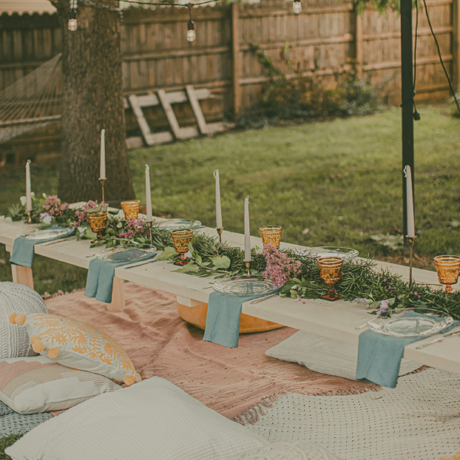 Celebració íntima amb decoració artesanal, taula baixa i ambient relaxat. Organització i muntatge cuidats al detall.